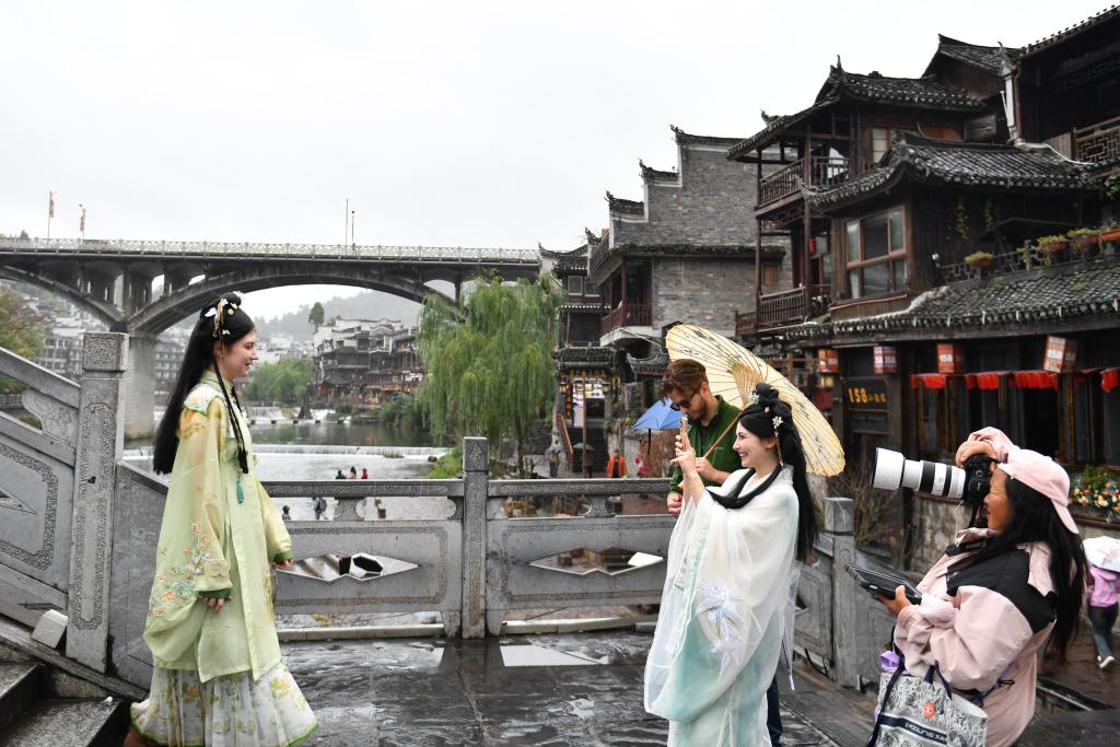 11月6日,外国游客身着“中国风”服装在凤凰古城拍照、游玩。新华社记者 陈振海 摄