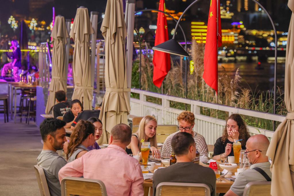 9月30日,外国游客在重庆市南岸区南滨路品尝重庆美食、欣赏夜景。新华社记者 黄伟 摄