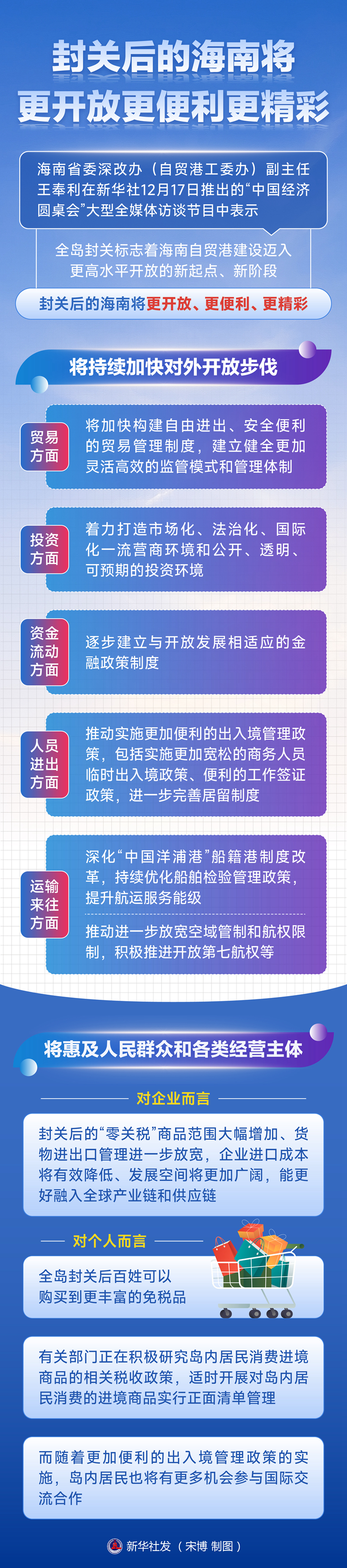 全岛封关运作将如何惠及人民群众和各类经营主体?王奉利指出,对企业而言,封关后的“零关税”商品范围大幅增加、货物进出口管理进一步放宽,企业进口成本将有效降低、发展空间将更加广阔,能更好融入全球产业链和供应链。对个人而言,全岛封关后百姓可以购买到更丰富的免税品。有关部门正在积极研究岛内居民消费进境商品的相关税收政策,适时开展对岛内居民消费的进境商品实行正面清单管理。而随着更加便利的出入境管理政策的实施,岛内居民也将有更多机会参与国际交流合作。