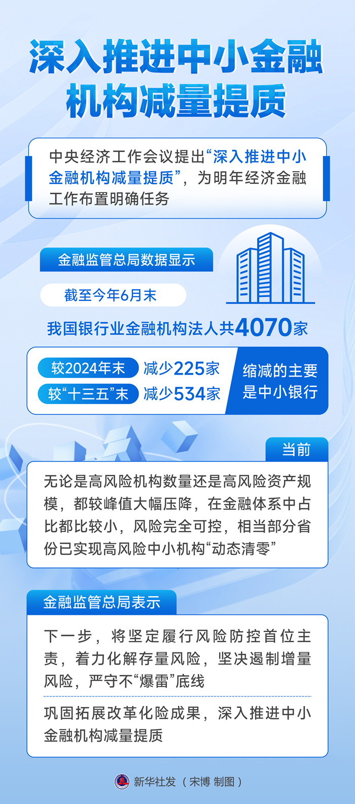 防控风险是金融工作的永恒主题,稳妥处置中小金融机构风险是重中之重。近年来,我国重点地区“一省一策”形成中小金融机构改革化险方案,综合采取兼并重组、在线修复、市场退出等多种方式稳妥推进。金融监管总局数据显示,截至今年6月末,我国银行业金融机构法人共4070家,较2024年末减少225家,较“十三五”末减少534家,缩减的主要是中小银行。