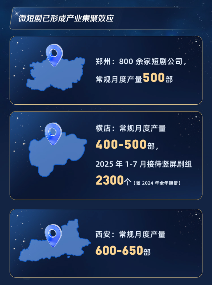 数据显示,全国短剧月度产量已稳定在约3000部,并在区域分工趋势下,带动就业从一线城市向中西部扩散。郑州、西安、横店等地,正成为这一产业地理格局的重要支点。