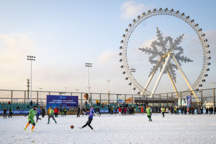 2025年12月20日,哈尔滨首届“冰雪绿茵”大众雪地足球挑战赛开幕。这是参赛球员在雪地上踢球。新华社记者 张涛 摄