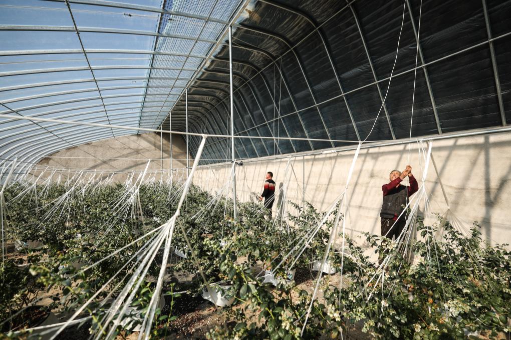村民在祝家沟村新建的高标准蓝莓大棚内进行日常维护工作。新华社记者 潘昱龙 摄