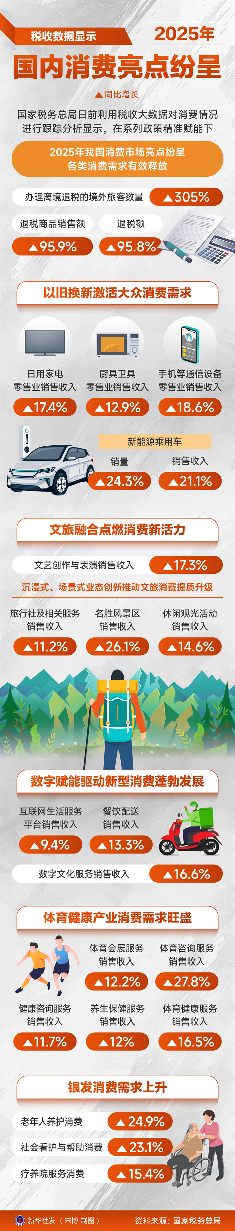 新华社北京1月26日电(记者刘开雄)记者1月26日从国家税务总局获悉,国家税务总局日前利用税收大数据对消费情况进行跟踪分析显示,在系列政策精准赋能下,2025年我国消费市场亮点纷呈,各类消费需求有效释放。其中,办理离境退税的境外旅客数量同比增长305%,退税商品销售额同比增长95.9%,退税额同比增长95.8%。