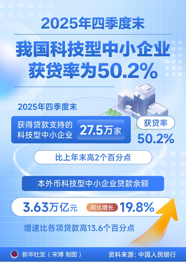 新华社北京1月27日电(记者吴雨)中国人民银行1月27日发布的数据显示,2025年四季度末,获得贷款支持的科技型中小企业27.5万家,获贷率为50.2%,比上年末高2个百分点。本外币科技型中小企业贷款余额3.63万亿元,同比增长19.8%,增速比各项贷款高13.6个百分点。