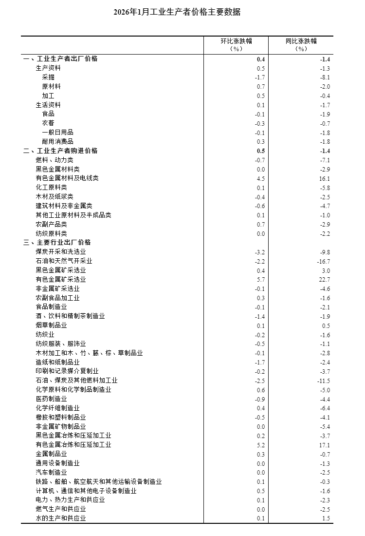 2026年1月份,全国工业生产者出厂价格同比下降1.4%,降幅比上月收窄0.5个百分点;环比上涨0.4%,涨幅比上月扩大0.2个百分点。工业生产者购进价格同比下降1.4%,降幅比上月收窄0.7个百分点;环比上涨0.5%,涨幅比上月扩大0.1个百分点。