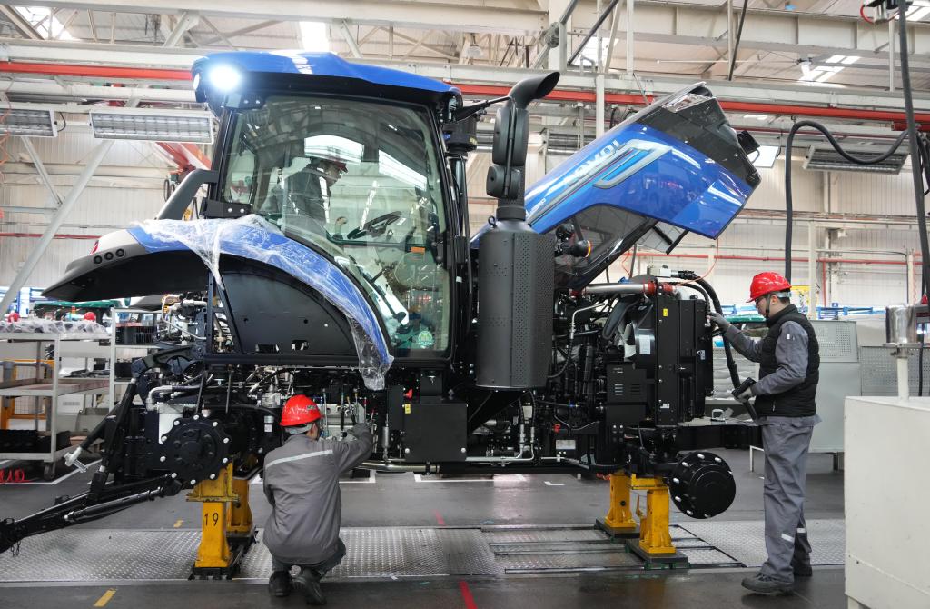 在潍柴雷沃智慧农业科技股份有限公司拖拉机工厂,工人在装配智能拖拉机(2024年8月21日摄)。新华社记者 李紫恒 摄