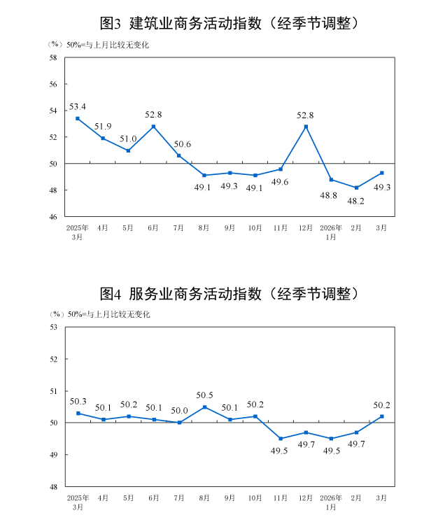 分行业看,建筑业商务活动指数为49.3%,比上月上升1.1个百分点;服务业商务活动指数为50.2%,比上月上升0.5个百分点。从服务业行业看,铁路运输、电信广播电视及卫星传输服务、货币金融服务、保险等行业商务活动指数均位于55.0%以上较高景气区间;零售、住宿、餐饮、房地产等行业商务活动指数均低于临界点。