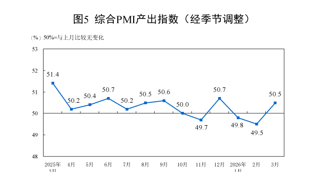 3月份,综合PMI产出指数为50.5%,比上月上升1.0个百分点,高于临界点,表明我国企业生产经营景气水平总体向好。