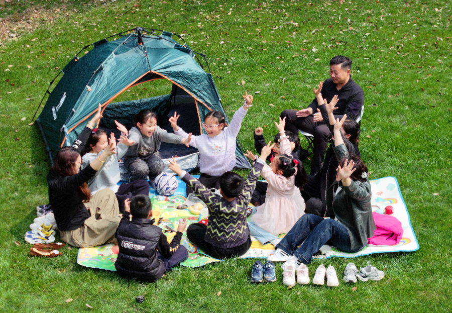 2026年4月1日,小朋友和家长在位于江苏省句容市的江苏农博园享受春假(无人机照片)。新华社记者 季春鹏 摄
