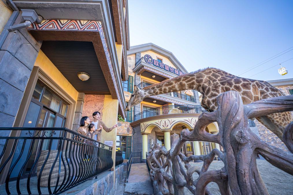 这家建在欧乐堡动物王国景区的酒店,以与长颈鹿等动物近距离互动、湖边垂钓等为特色,吸引了不少亲子游、研学游的客流。在酒店接待中心,记者遇到了来自山西太原的游客姚先生。“去年看到酒店里长颈鹿与游客近距离互动的视频,很心动,今年特意带着孩子来体验。”姚先生说。
