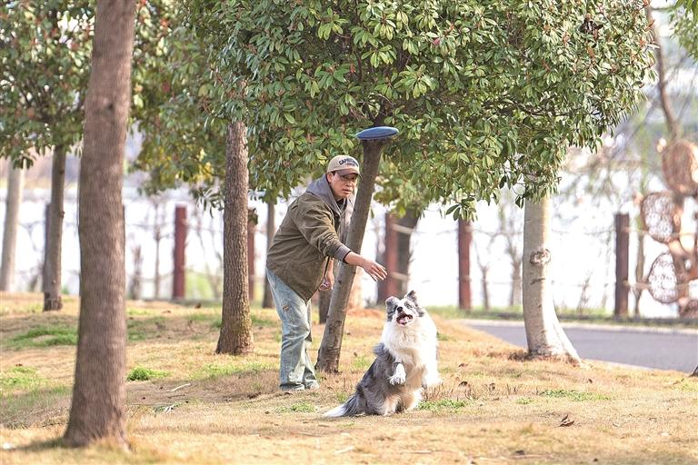 湖南常德,市民在穿紫河畔与宠物嬉戏。新华社发