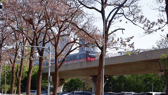 记者带你走进赛事举办线路之一、亦庄泡桐大道,感受花开北京浪漫中的“赛博”气息。