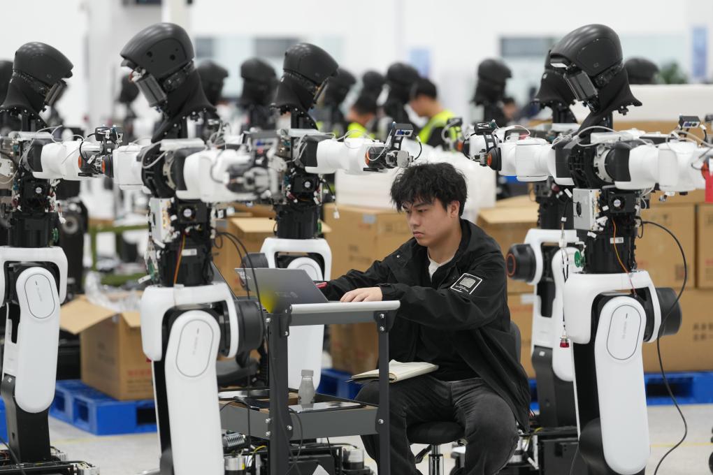 3月24日,在宁波普智未来机器人有限公司,技术人员在调试实现量产的人形机器人。新华社记者黄宗治 摄