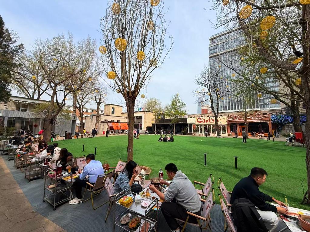 4月2日中午,食客在北京友谊商店室外草坪露天就餐。新华社记者 张骁 摄
