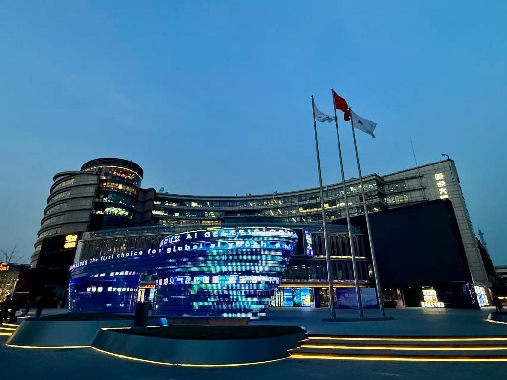 4月1日,夜幕下的“AI原点社区”依然灯火通明。新华社记者 张骁 摄
