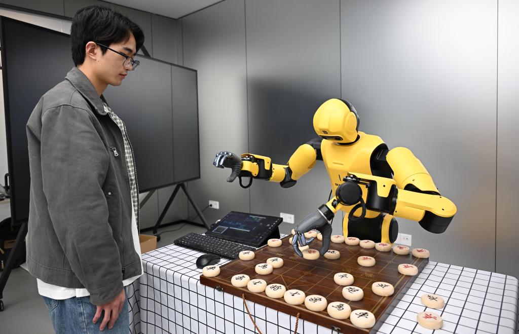 4月7日,在广州海珠区的广东省具身智能训练场,工作人员和机器人对弈。新华社记者 邓华 摄