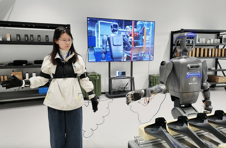 在位于长春市的吉林省仿生机器人创新中心内,数据采集训练工程师王婷婷正在“教”具身机器人抓取汽车零部件。