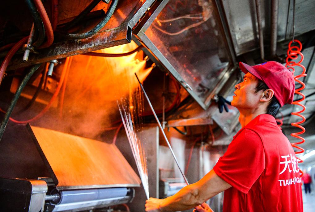 4月19日,工人在内蒙古天皓玻纤有限责任公司的玻璃纤维生产线上作业。新华社发(康文魁 摄)