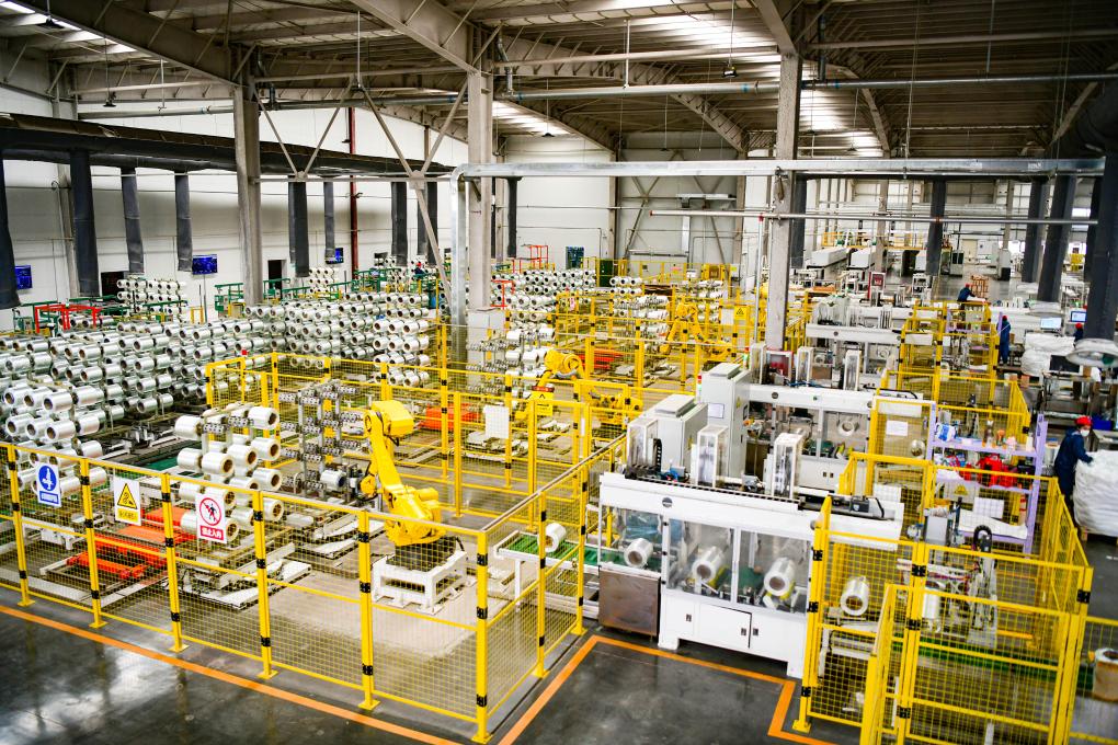 4月19日,机械手在内蒙古天皓玻纤有限责任公司的玻璃纤维生产车间作业。新华社发(康文魁 摄)