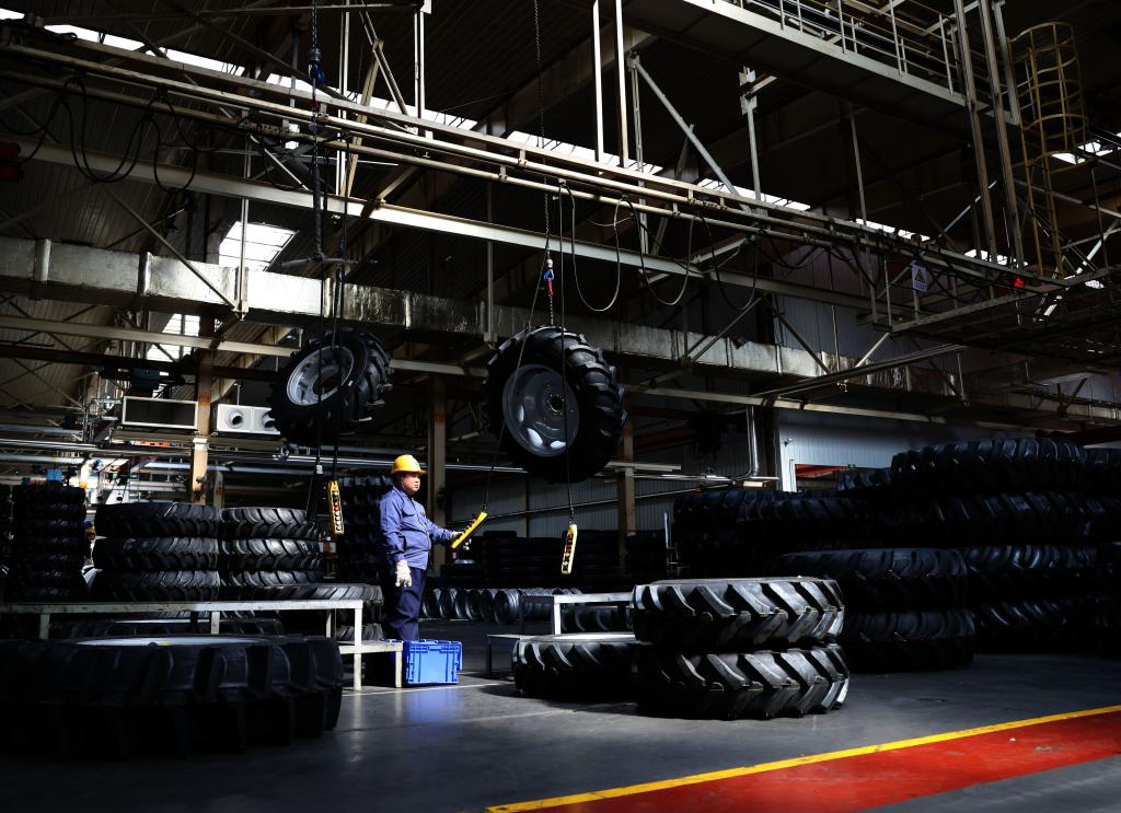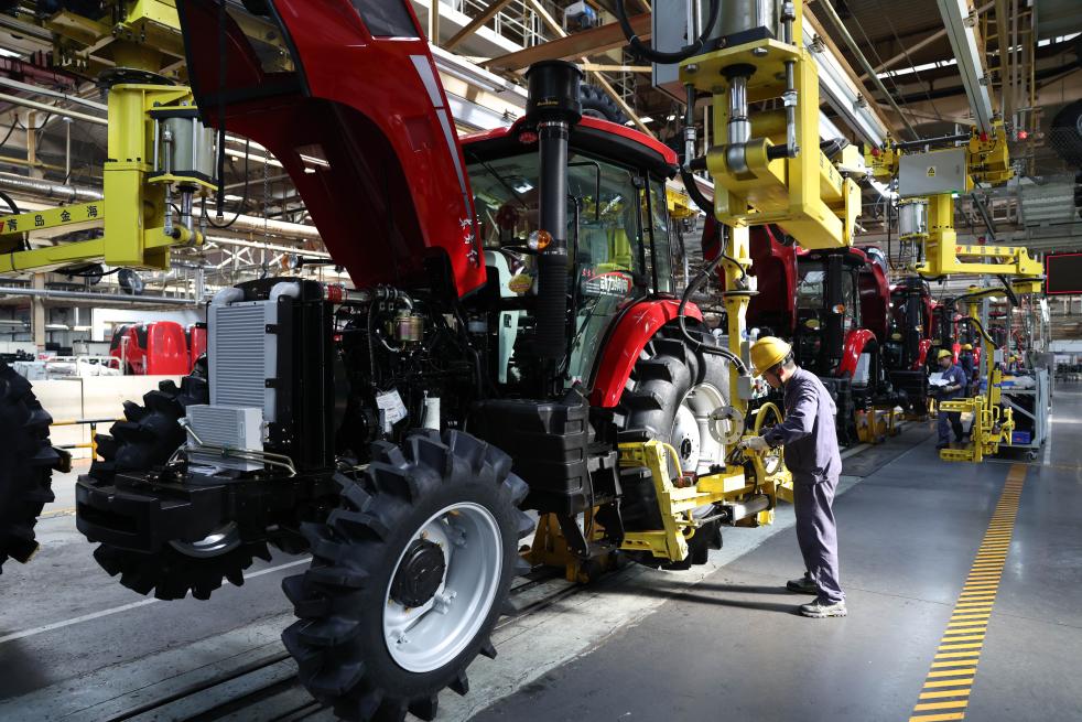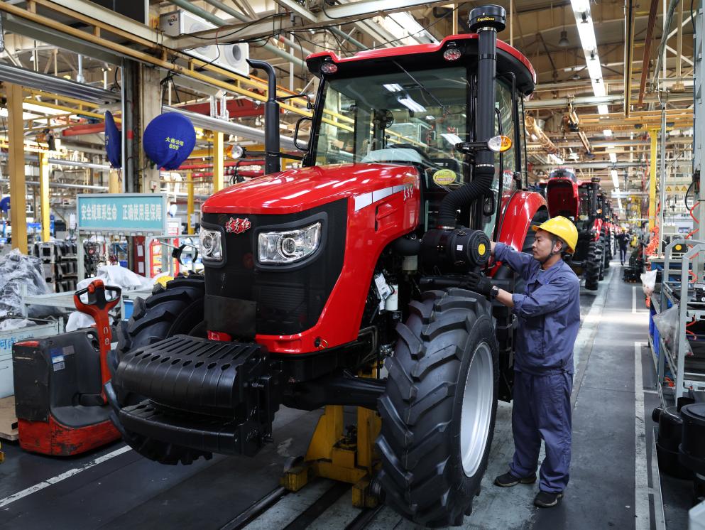 2026年4月14日,工人在位于河南洛阳的国机集团中国一拖大轮拖总装线作业。新华社记者 李嘉南 摄