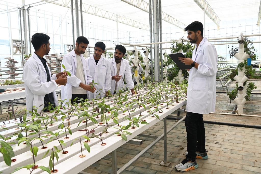 在张掖市山丹县培黎职业学院,巴基斯坦留学生在现代农业产教融合实践基地进行实操练习。新华社记者 范培珅 摄