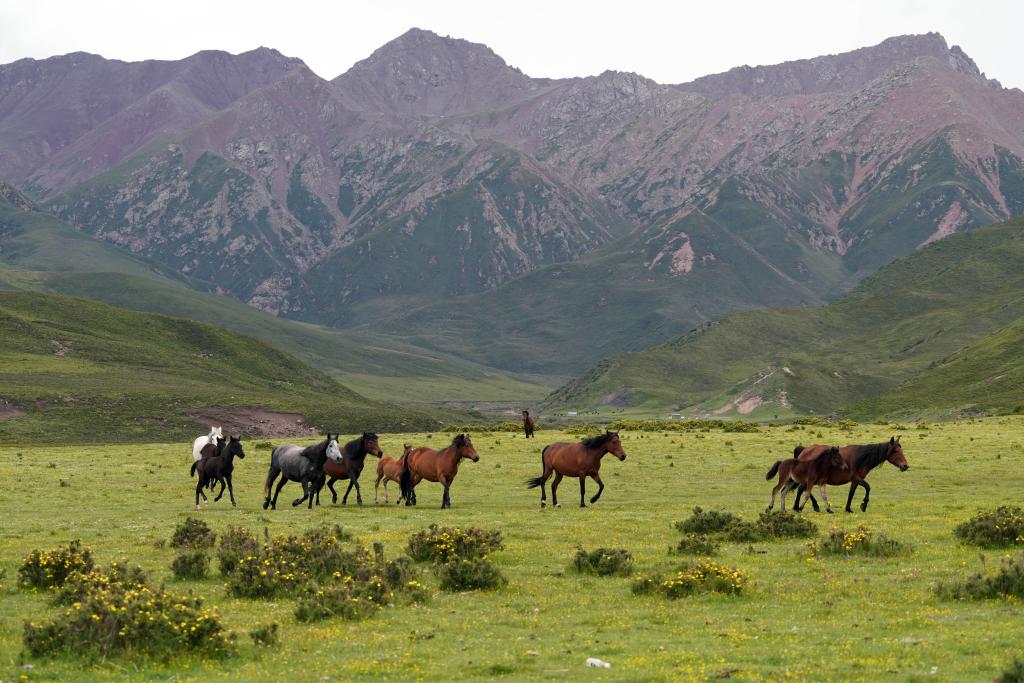 在张掖市肃南裕固族自治县皇城镇境内的祁连山脚下,马群在草原上奔跑。新华社记者 马宁 摄