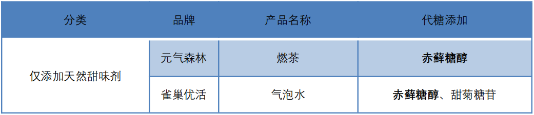 目前市场上的无糖饮料,在代糖选择方面体现出了较大区别。在中科院调研的 19 款无糖饮料中,仅2款饮料只添加了天然甜味剂,分别为元气森林的燃茶和雀巢的优活气泡水。其中,燃茶仅添加赤藓糖醇,优活气泡水添加了赤藓糖醇和甜菊糖苷。