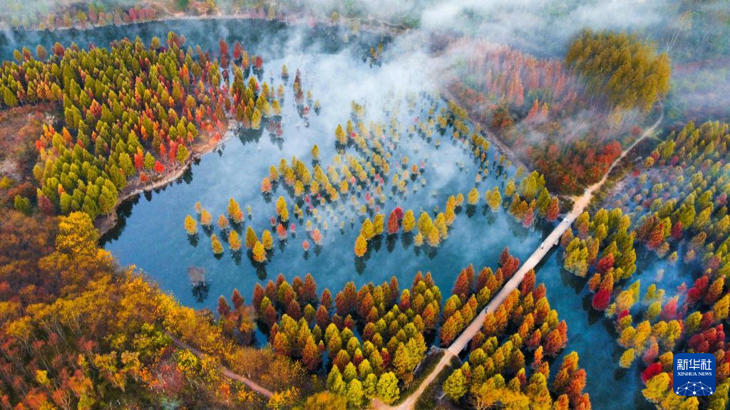 近日,云南省昆明市盘龙区滇源街道甸尾村水杉湿地的水杉林色彩艳丽,景色如画。