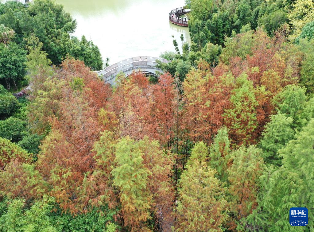 初冬时节,广西南宁市多个公园的杉树树叶日渐变红,分外靓丽。