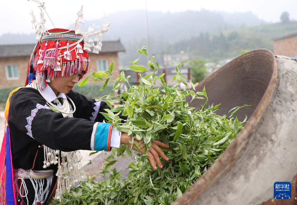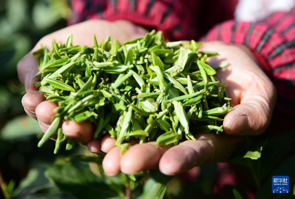 3月14日,在柳州市三江侗族自治县八江镇布央村,侗族姑娘在展示三江早春茶新芽。