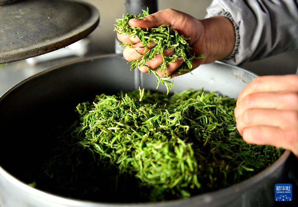 3月21日,在湖北省宣恩县万寨乡伍家台村一茶企加工车间,工人手工感知杀青后茶叶的水分含量。