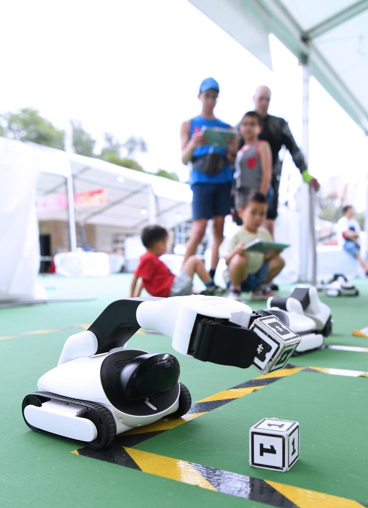 2024年7月1日,儿童在AI+智慧时代展区操控机器人。2024年6月29日至7月2日,香港维多利亚公园举行以“万千气象看中华”为主题的“维园庆回归”活动,科技赋能是此次活动主题之一。新华社记者 陈铎 摄