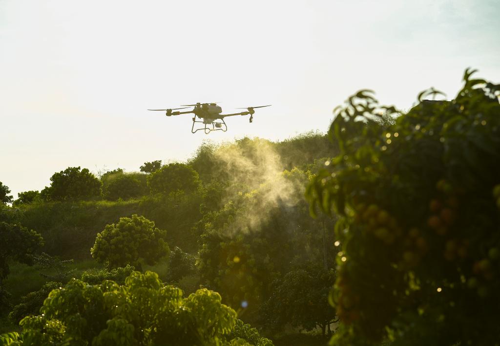 2024年6月21日,大疆农业植保机在广州增城的荔枝林进行喷洒作业。新华社记者 毛思倩 摄