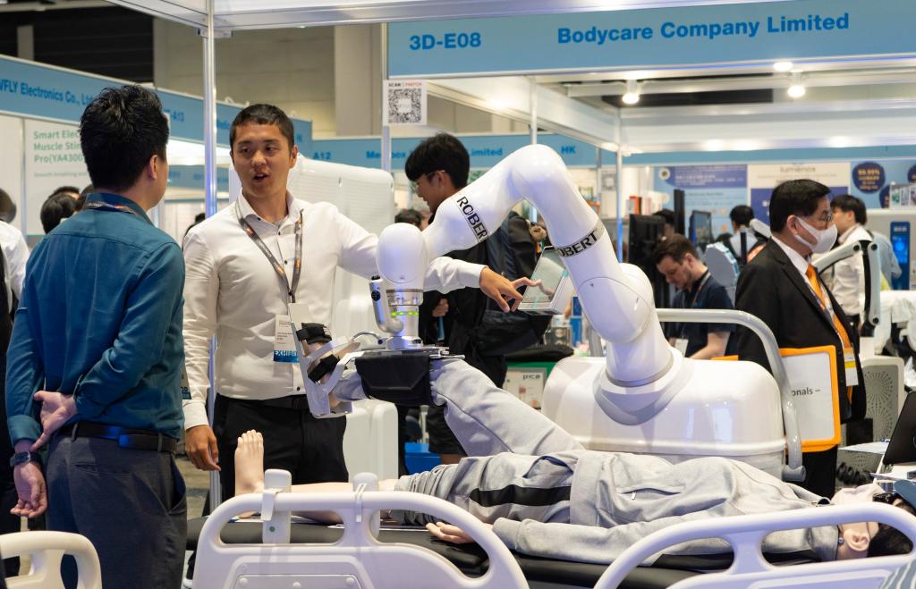 2024年5月17日,在第十五届“香港国际医疗及保健展”上,展商向参观者介绍科技医疗产品。新华社记者 龙镜伊 摄