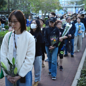 在金紫荆广场、大埔海滨公园……香港特区所有政府建筑物及设施的国旗及区旗下半旗志哀。在宏福苑附近的公园,人们排起长队等待献花,表达哀思。