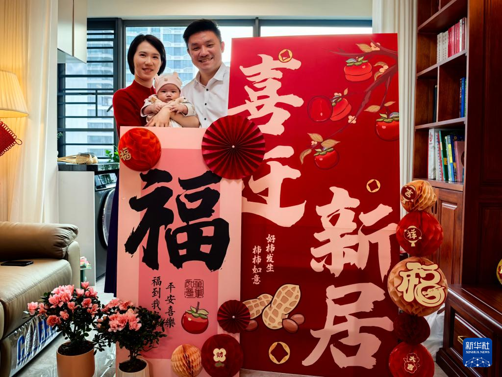 2024年12月6日,苏柏静(左)、丈夫黄滋才(右)和孩子在横琴澳门新街坊的家里合影。新华社发(张金加 摄)