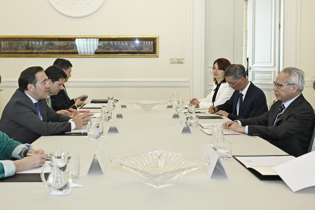 4月22日,在西班牙马德里,澳门特区行政长官岑浩辉(右一)会见西班牙外交大臣阿尔瓦雷斯(左一)。新华社发(澳门新闻局供图)