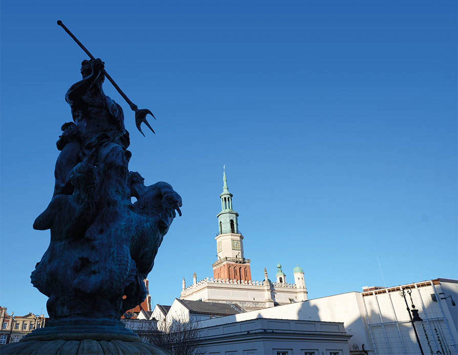 这是4月2日在波兰西部城市波兹南老城广场上拍摄的海神喷泉