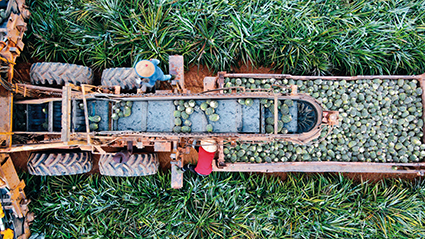 2023年7月5日,在印度尼西亚楠榜省印尼巨大菠萝有限责任公司菠萝种植园,人们将采摘下来的菠萝装车(无人机照片)