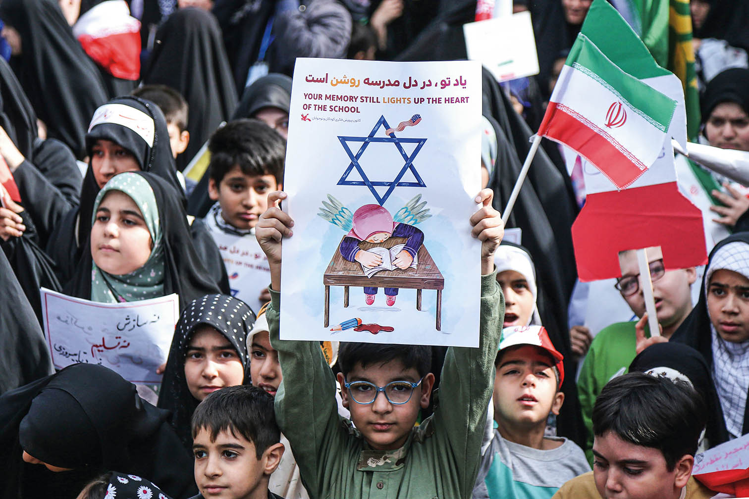 2026年4月7日,在伊朗首都德黑兰,一名男孩参加集会时举起海报,悼念遭美以空袭遇难的米纳卜小学学生