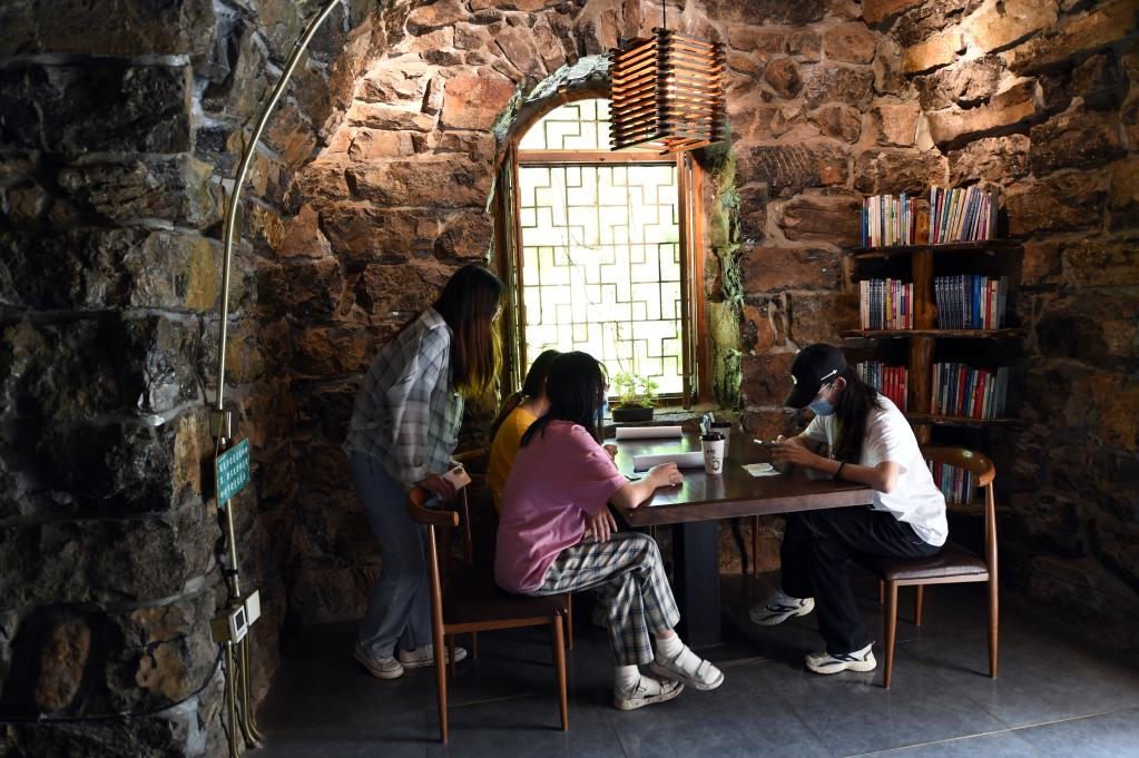 游客在吕家村老旧建筑改造而成的书吧休闲游玩。新华社记者 骆学峰 摄