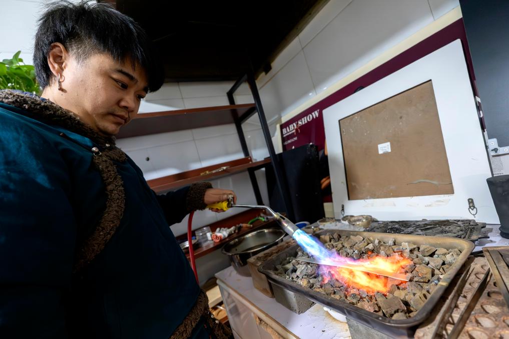 11月14日,在内蒙古乌拉特前旗禾苏格尔银匠店内,齐天赐在熔银。