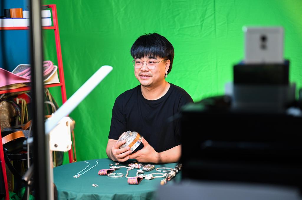 11月14日,在内蒙古乌拉特前旗的直播工作室内,齐天赐在网络直播卖银饰。