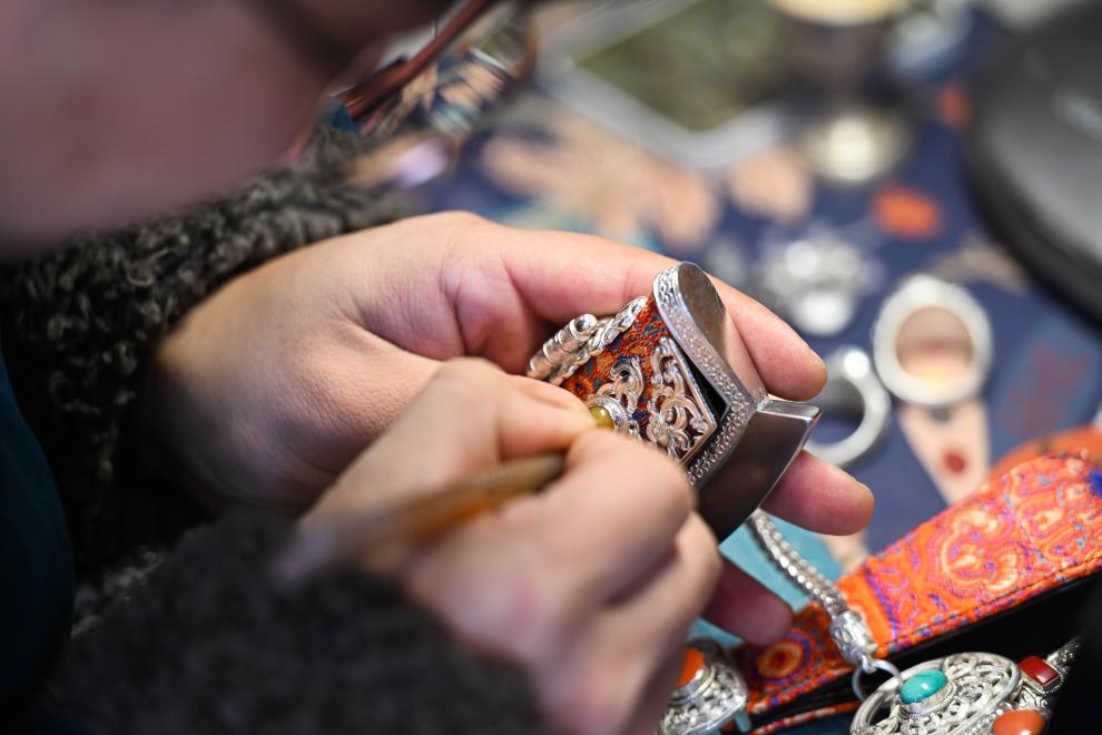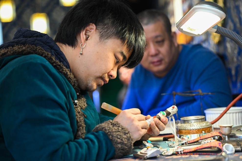 11月14日,在内蒙古乌拉特前旗禾苏格尔银匠店内,齐天赐在加工银器。