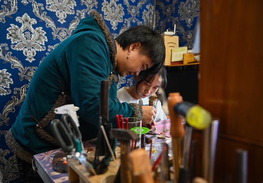 11月14日,在内蒙古乌拉特前旗禾苏格尔银匠店内,齐天赐(左)在教授学徒。