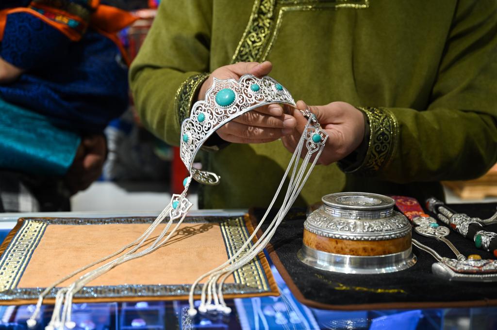 11月14日,在内蒙古乌拉特前旗禾苏格尔银匠店内,齐天赐展示自己制作的手工银饰。