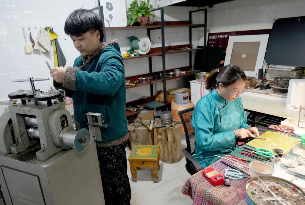 11月14日,在内蒙古乌拉特前旗禾苏格尔银匠店内,齐天赐(左)与爱人苏晓霞一同加工银器。
