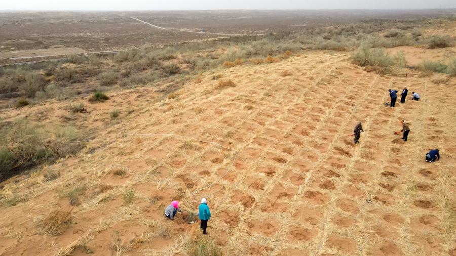 新华社兰州6月16日电(记者郭刚、程楠)南风掠过,沙漠之上,片片草木摇曳生姿,一场与风沙的无声“战役”仍在持续——挖坑补种树苗、植草浇水的身影穿梭其间,为这片曾经的荒芜之地再添新绿。
