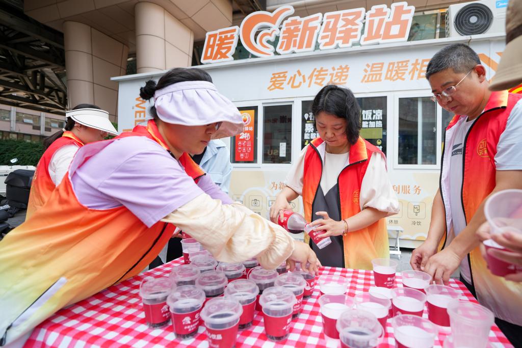 6月25日,在北京市东城区崇外街道一处“暖新驿站”外,街道工作人员在为高温下的外卖员、快递员准备冰镇饮料。